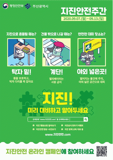 Á¤ºÎ´Â ±¹³» ÃÖ´ëÀÎ ±Ô¸ð 5.8ÀÇ ÁöÁøÀÌ 2016³â¿¡ °æÁÖ¿¡¼ ¹ß»ýÇÔ¿¡ µû¶ó ÁöÁø¿¡ ´ëÇÑ °æ°¢½ÉÀ» °íÃëÇÏ°í ±× ´ç½Ã¸¦ µÇ¤¾î º¸±â À§ÇØ 2017³âºÎÅÍ ¸Å³â 9¿ù¿¡ ÁöÁø¾ÈÀüÁÖ°£À» Á¤ÇÏ¿© ¿î¿µÇϰí ÀÖ´Ù. ÀÌ ±â°£¿¡´Â ÇàÁ¤¾ÈÀüºÎ ÁÖ°üÀ¸·Î Àü±¹ ÁöÀÚü ¹× °¢ ºÎó°¡ ÇÕµ¿ÇÏ¿© °ü·Ã Ä·ÆäÀÎÀ» ÁøÇàÇÑ´Ù.