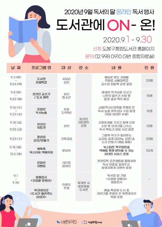 ¡®µµ¼°üÀÇ ON!¡¯ ÇÁ·Î±×·¥Àº ¡ã¿Â¶óÀÎ ±Û¾²±â¿Í ³ª¸¸ÀÇ Ã¥ ¸¸µé±â ¡ã¿Â¶óÀÎ ºÏÅäÅ© µ¶¼Åä·Ð ¡ã¿Â¶óÀÎ ÇϺθ£Å¸ µ¶¼³í¼ú ¡ã¿Â¶óÀÎ Àι®ÇÐ °¿¬ ¡ã¿Â¶óÀÎ ¹®È¿¹¼ú °ø¿¬ µî ¿Â¶óÀÎ °ÀǸ¦ ¸Å°³·Î ±¸¼ºµÆ´Ù. ³ª¾Æ°¡ ¡ãºÏ½ºÅ¸Æ® Ã¥²Ù·¯¹Ì ÅÃ¹è ¹ß¼Û ¡®ºÏ¶È¶È¡¯ ¡ã¿Â¶óÀÎ µ¶¼ÀÎÁõ À̺¥Æ® µî ´Ù¹æ¸éÀÇ ºñ´ë¸é µ¶¼ Ȱµ¿µµ Áö¿øÇÒ ¿¹Á¤ÀÌ´Ù.