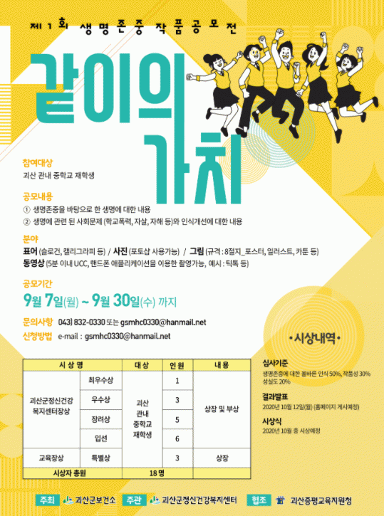 °ø¸ðÀü°ú °ü·ÃÇÑ ÀÚ¼¼ÇÑ ³»¿ëÀº ±«»ê±º Á¤½Å°Ç°º¹Áö¼¾ÅÍ(043-832-0330)·Î ¹®ÀÇÇÏ¸é µÈ´Ù.