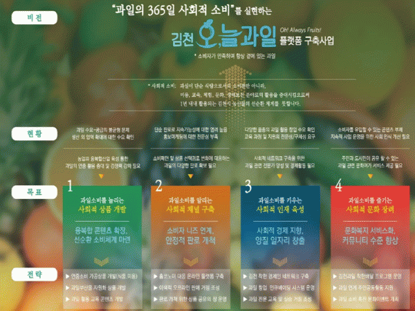 º»»ç¾÷Àº Áö¿ªÀÇ ³ó»ê¹°À» Ȱ¿ëÇÑ¡º¡°°úÀÏÀÇ 365ÀÏ »çȸÀû ¼Òºñ¡±¸¦ ½ÇÇöÇÏ´Â ±èõ ¿À,´Ã°úÀÏ Ç÷§Æû ±¸Ãà»ç¾÷¡»À» ºñÀüÀ¸·Î °úÀϼҺñ¸¦ ´Ã¸®´Â »çȸÀû »óǰ°³¹ß, ¾ÈÁ¤Àû ÆÇ·Î°³Ã´, ÀÚ»ýÀû °æÁ¦Á¶Á÷ À°¼º, µµ³ó±³·ù È®´ë¸¦ ¸ñÇ¥·Î ÀÚ¸³Àû Áö¼ÓÀû ¼ºÀåÀÌ °¡´ÉÇϵµ·Ï »ç¹«±¹ ±¸¼º, ¾×¼Ç±×·ì ÇùÀÇ, ±âº»°èȹ ¼ö¸³ µî ·Îµå¸Ê¿¡ µû¶ó º»°ÝÀûÀ¸·Î »ç¾÷À» ÃßÁøÇØ ³ª°¥ °èȹÀÌ´Ù.
