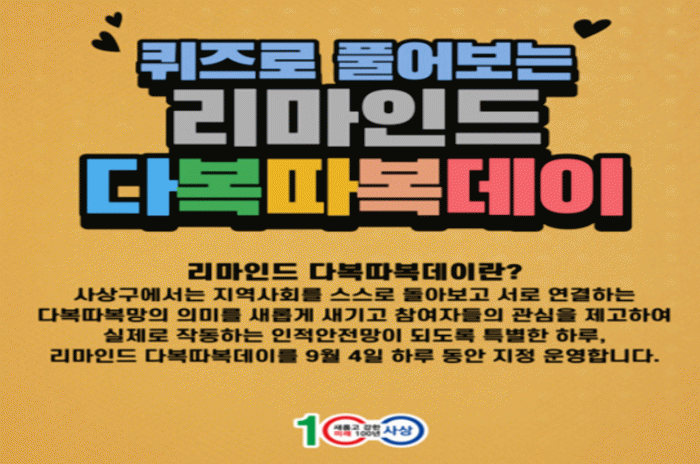 ¡®ÄûÁî·Î Ç®¾îº¸´Â ¸®¸¶ÀÎµå ´Ùº¹µûº¹µ¥ÀÌ¡¯´Â ±¸Ãà 4³âÂ÷¸¦ ¸Â´Â »ç»ó±¸ Áö¿ª¿¬´ë ÀÎÀû¾ÈÀü¸ÁÀÎ ´Ùº¹µûº¹¸Á(´Ù ÇÔ²² ÇູÇÏ°í µû¶æÇÑ º¹Áö¾ÈÀü¸Á)ÀÌ ½ÇÁ¦·Î ÀÛµ¿Çϰí ÀÖ´ÂÁö Á¡°ËÇϰí, Àû±ØÀûÀÎ Âü¿©¸¦ À¯µµÇϱâ À§ÇØ ÄûÁ Ç®¾îº¸´Â Ưº°ÇÑ ÇÏ·ç À̺¥Æ®ÀÌ´Ù.