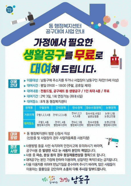 ³²µ¿±¸¿¡ °ÅÁÖÇϰųª »ç¾÷ÀåÀ» µÐ »ç¶÷À̶ó¸é ´©±¸³ª µ¿ ÇàÁ¤º¹Áö¼¾ÅÍ¿¡¼ ÃæÀüµå¸±, ÇØ¸Óµå¸±, °¡Á¤¿ë °ø±¸¼¼Æ® µî ÃÖ´ë 4Á¾ÀÇ »ýȰ °ø±¸¸¦ »çÈê°£ ¹«·á·Î ´ë¿© ¹ÞÀ» ¼ö ÀÖ´Ù.