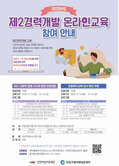 Á¦2ÀÇ ÀλýÀ» ÁغñÇÏ´Â ÀλýÀç¼³°è¿¡ °ü½ÉÀÌ ÀÖ´Â 50¼¼ ÀÌ»ó ÀÎõ½Ã¹ÎÀÌ¸é ´©±¸³ª Âü¿© °¡´ÉÇϸç, ±³À° ½ÃûÀº ÀÎõ°í·É»çȸ¼¾ÅÍ È¨ÆäÀÌÁö(www.inlife.or.kr)ÀÇ ¡®¿Â¶óÀÎ ±³À° ½Ãû¡¯ÆäÀÌÁö¸¦ ÀÌ¿ëÇϰųª, À¯Æ©ºê ä³Î¡®ÀÎõ°í·É»çȸ´ëÀÀ¼¾ÅÍ¡¯¸¦ °Ë»öÇÏ¸é ½ÃûÇÒ ¼ö ÀÖÀ¸¸ç, ÀÌ ¹Û¿¡ ÀÚ¼¼ÇÑ »çÇ×Àº ÀÎõ°í·É»çȸ´ëÀÀ¼¾ÅÍ (032-715-5491)·Î ¹®ÀÇÇÏ¸é µÈ´Ù.