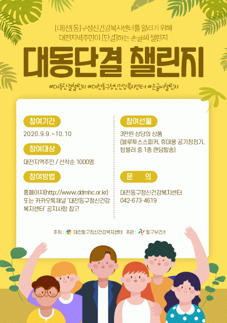 ¡®´ëµ¿´Ü°á 縰Áö¡¯´Â ¡®´ë¡¯Àü ¡®µ¿¡¯±¸Á¤½Å°Ç°º¹Áö¼¾Å͸¦ ¾Ë¸®±â À§ÇØ ´ëÀüÁö¿ª ÁÖ¹ÎÀÌ ¡®´Ü°á¡¯ÇÏ´Â ¼Õ±Û¾¾ 縰Áö·Î Á¤½Å°Ç°º¹Áö¼¾ÅÍ È«º¸¸¦ ÅëÇØ Á¤½Å°Ç°¿¡ ´ëÇÑ °ü½É°ú Âü¿©¸¦ À¯µµÇϰí Á¤½ÅÁúȯ¿¡ ´ëÇÑ Æí°ßÇØ¼Ò¿Í »çȸÀû ÀνÄÀ» °³¼±ÇϰíÀÚ ¸¶·ÃµÆ´Ù.