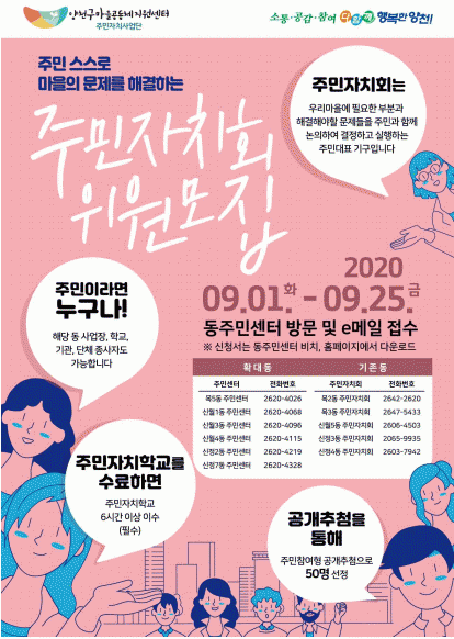 ½ÅûÀ» ¿øÇÏ´Â ÀÚ´Â 11°³ µ¿ Áֹμ¾ÅÍ(ÀÚġȸ°ü)¸¦ ¹æ¹®ÇÏ¿© ½Åû¼¸¦ Á¦ÃâÇϰгª ¿Â¶óÀÎ À̸ÞÀÏ·Î ½ÅûÇÒ ¼ö ÀÖÀ¸¸ç, 10¿ù¿¡ °³ÃֵǴ ÁÖ¹ÎÀÚÄ¡Çб³¸¦ 6½Ã°£ Çʼö·Î À̼öÇØ¾ß ÇÑ´Ù. À§ °úÁ¤À» ¸¶Ä¡¸é ÇØ´ç µ¿ À§¿ø¼±Á¤°ü¸®À§¿øÈ¸¿¡¼ ÁÖ¹ÎÀÚ Ä¡Çб³ ¼ö·áÀÚ¸¦ ´ë»óÀ¸·Î °ø°³ Ãß÷ÇÏ¿© À§¿øÀ» ÃÖÁ¾ ¼±Á¤ÇÏ°Ô µÈ´Ù.