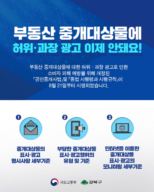 Áß°³´ë»ó¹° ±¤°í¿¡´Â ¼ÒÀçÁö, ¸éÀû, °¡°Ý, °Å·¡ÇüÅÂ¿Í °°Àº Áß¿äÁ¤º¸°¡ ¹Ýµå½Ã Ç¥±âµÅ¾ß ÇÑ´Ù. °ÇÃ๰ÀÇ ¹æ°ú ¿å½Ç °³¼ö, ÁÖÂ÷´ë¼ö, ÀÔÁÖ°¡´ÉÀÏ, °ü¸®ºñ µîµµ Àǹ« ¸í½Ã ´ë»óÀÌ´Ù. °³¾÷°øÀÎÁß°³»çÀÇ ¼º¸í, ¿¬¶ôó, µî·Ï¹øÈ£ À̿ܿ¡ Áß°³ º¸Á¶¿øÀÇ Á¤º¸¸¦ ¿Ã·Á¼± ¾È µÈ´Ù.