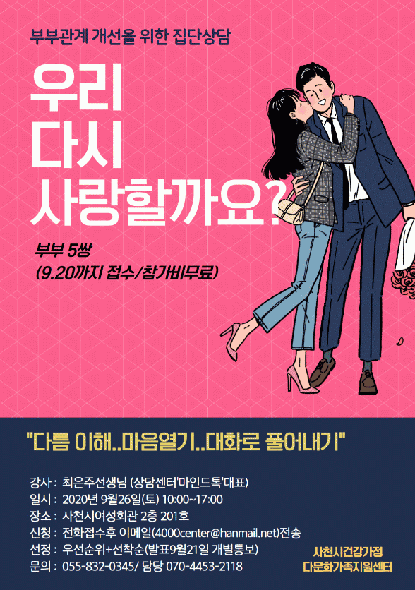 »ó´ãÀÇ ³»¿ëÀº ¼ºÀξÖÂø À¯Çü°Ë»ç µîÀ» ÅëÇÑ ºÎºÎÀÇ ´Ù¸§ ÀÌÇØÇϱâ, °í¸®(°ü°èÆÐÅÏ)µîÀ» ÀÌÇØÇÔÀ¸·Î½á Á¤¼³ª´©±â, Á¤¼Ç¥ÇöÀ¸·Î ¼·ÎÀÇ ±íÀº ¸¶À½ ÀÌÇØÇϱâ, ºÎºÎ °¥µîÀ» ´ëÈ·Î Ç®¾î³»±â µî ¿ÀÀü 10½ÃºÎÅÍ ¿ÀÈÄ 5½Ã±îÁö 3ȸ±â(ÃÑ 6½Ã°£)¿¡ °ÉÃÄ ¿î¿µµÉ ¿¹Á¤ÀÌ´Ù.