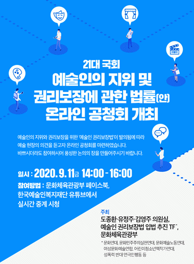 À̹ø °øÃ»È¸¿¡¼´Â ´Ù½Ã ¹ßÀÇµÈ ¡¸¿¹¼úÀÎ ±Ç¸®º¸Àå¹ý¡¹ÀÇ ¹ý¾Èü°è, ÁÖ¿ä ³»¿ë, ¼öÁ¤»çÇ× µî¿¡ ´ëÇØ ³íÀÇÇϰí, ¿¹¼úÀÎÀÇ ÁöÀ§¿Í ±Ç¸®¸¦ ½ÇÁúÀûÀ¸·Î º¸ÀåÇϱâ À§ÇØ ¿¹¼úÇöÀåÀÇ ´Ù¾çÇÑ ÀǰßÀ» ¼ö·ÅÇÒ °èȹÀÌ´Ù.