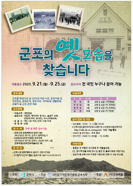 ÀÚ¼¼ÇÑ ³»¿ëÀº ±ºÆ÷½Ã ¹®ÈüÀ°°ú(031-390-0748), ¶Ç´Â Çѱ¹»çÁøÀÛ°¡Çùȸ ±ºÆ÷ÁöºÎ(010-5426-5617)·Î ¹®ÀÇÇÏ¸é ¾È³»¹ÞÀ» ¼ö ÀÖ´Ù.