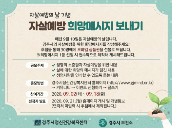 ¶ÇÇÑ ÀÌ´Þ Áß Áö¿ªÁÖ¹ÎÀ» ´ë»óÀ¸·Î ¸±·¹ÀÌ »ý¸í ¼¾à¼¸¦ ÀÛ¼ºÇÏ´Â ¡®¸¶ÀÎµå ½º¸¶ÀÏ Ã§¸°Áö¡¯¸¦ ÁøÇàÇϸç, »ý¸íÀÇ ¼ÒÁßÇÔÀ» ¾Ë¸®±â À§ÇÑ ¡®»ý¸í»ç¶û À½¾Ç ¸Þ½ÃÁö-¸¶À½À» µè´Ù¡¯ ¿µ»óÀ» Á¦ÀÛÇØ °æÁÖ½ÃÁ¤½Å°Ç°È¨ÆäÀÌÁö(http://www.gjmind.or.kr)¿¡ °Ô½ÃÇØ »ý¸íÁ¸Áß¹®È È®»êÀ» À§ÇÑ ºñ´ë¸é Ä·ÆäÀεµ ÁøÇàÇÑ´Ù.