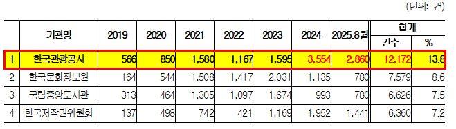 Çѱ¹°ü±¤°ø»ç¿¡ ´ëÇÑ ÇØÅ· °ø°Ý ½Ãµµ´Â 2019³â 566°Ç¿¡¼ 2024³â 3,554°ÇÀ¸·Î 6¹è ÀÌ»ó Áõ°¡ÇßÀ¸¸ç, ¿ÃÇØ 8¿ù±îÁö ÀÌ¹Ì 2,860°ÇÀÌ Àû¹ßµÆ´Ù. µÚ¸¦ ÀÌ¾î ¡ãÇѱ¹¹®ÈÁ¤º¸¿ø(7,579°Ç) ¡ã±¹¸³Áß¾Óµµ¼°ü(6,626°Ç) ¡ãÇѱ¹ÀúÀÛ±ÇÀ§¿øÈ¸(6,360°Ç) ¡ãÇѱ¹¾ð·ÐÁøÈïÀç´Ü(3,814°Ç) ¼øÀ¸·Î ÇØÅ· °ø°ÝÀÌ ¸¹¾Ò´Ù.