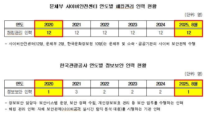 Àüü ÇØÅ· ½Ãµµµµ ÇØ¸¶´Ù ´Ã°í ÀÖ´Ù. ¡ã2019³â 3,954°Ç ¡ã2020³â 5,390°Ç ¡ã2021³â 11,206°Ç ¡ã2022³â 13,863°Ç ¡ã2023³â 19,650°Ç ¡ã2024³â 19,662°ÇÀ¸·Î Áõ°¡¼¼°¡ ¶Ñ·ÇÇÏ´Ù. ±×·¯³ª ´ëÀÀÀηÂÀº Á¦ÀÚ¸®°ÉÀ½ÀÌ´Ù. ¹®Ã¼ºÎ »çÀ̹ö¾ÈÀü¼¾ÅÍÀÇ ÇØÅ· °ü¸® ÀηÂÀº 6³â° 12¸í¿¡ ¸Ó¹°·¯ ÀÖÀ¸¸ç, ƯÈ÷ Çѱ¹°ü±¤°ø»ç´Â Á¤º¸º¸¾È ´ã´çÀÚ¸¦ 2020³â 1¸í¿¡¼ 2021³â 3¸íÀ¸·Î ´Ã·ÈÁö¸¸, 4³âÀÌ Áö³ ¿ÃÇØ ´Ù½Ã 1¸íÀ¸·Î ÁÙ¾îµç °ÍÀ¸·Î È®ÀεƴÙ.