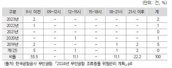 ±è ÀÇ¿øÀÌ È®ÀÎÇÑ Çѱ¹°øÇ×°ø»ç ¹«¾È°øÇ×ÀÇ ¡¸2024³â ¹«¾È°øÇ× Á¶·ùÃæµ¹ À§Çè°ü¸®°èȹ¡¹¿¡ µû¸£¸é, ÃÖ±Ù 5³â°£ ¹ß»ýÇÑ Á¶·ùÃæµ¹ »ç°íÀÇ 55%°¡ ¿ÀÀü 9½Ã ÀÌÀü¿¡ ÁýÁßµÈ °ÍÀ¸·Î ³ªÅ¸³µ´Ù. Á¶·ùÃæµ¹ À§ÇèÀÌ À̸¥ ¿ÀÀü ½Ã°£´ë¿¡ ƯÈ÷ ³ô´Ù´Â Á¡À» °øÇ× ÃøÀÌ ÀÌ¹Ì ÀÎÁöÇϰí ÀÖ¾ú´Ù´Â Àǹ̴Ù.
