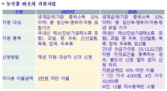 Áö¿ø ±â°£Àº ¿ÃÇØ 1¿ùºÎÅÍ 12¿ù±îÁö 12°³¿ùÀÌ´Ù. Áֹεî·Ï ÁÖ¼ÒÁö °üÇÒ À¾¸éµ¿ ÇàÁ¤º¹Áö¼¾Å͸¦ ¹æ¹®Çϰųª ¿Â¶óÀÎ(www.foodvoucher.go.kr)°ú ÀüÈ(1551-0857)¸¦ ÅëÇØ ½ÅûÇÒ ¼ö ÀÖ´Ù.