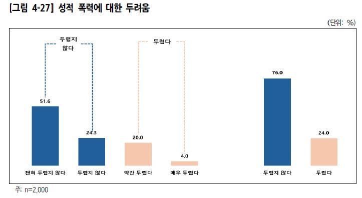 Æø·Â¿¡ ´ëÇÑ µÎ·Á¿òÀÇ °æ¿ì ¡®´ÊÀº ¹ã°Å¸®¸¦ Áö³ª°¡°Å³ª Åýø¦ Å» ¶§ µÎ·Æ´Ù¡¯(57.3%)°í ´À³¢´Â °æ¿ì°¡ °¡Àå ¸¹¾Ò´Ù. ±× ´ÙÀ½À¸·Î ¡®ºÒ¹ýÃÔ¿µ¿¡ ´ëÇÑ µÎ·Á¿ò¡¯(39.1%), ¡®Áý¿¡ È¥ÀÚ ÀÖÀ» ¶§ ³¸¼± »ç¶÷ÀÇ ¹æ¹®¿¡ ´ëÇÑ µÎ·Á¿ò¡¯(38.4%) ¼øÀ̾ú´Ù. ¡®¼ºÃßÇàÀ̳ª ¼ºÆø·Â ÇÇÇØ¿¡ ´ëÇÑ µÎ·Á¿ò¡¯(24.0%)µµ ³ôÀº ¼öÁØÀ¸·Î ³ªÅ¸³ª, Àû¾îµµ ¿©¼º 4¸í Áß 1¸íÀº ÀÏ»óÀûÀ¸·Î ¼ºÀû Æø·Â¿¡ ´ëÇÑ µÎ·Á¿òÀ» ´À³¢°í ÀÖ¾ú´Ù.