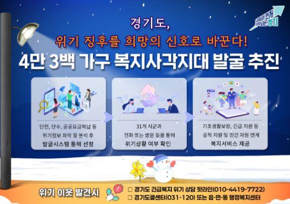 ÇѰæ¼ö °æ±âµµ º¹Áö»ç¾÷°úÀåÀº ¡°°Ü¿ïöÀº Àú¼ÒµæÃþÀÇ ³­¹æºñ ºÎ´ã Áõ°¡·Î Ãë¾à°èÃþÀÇ ¾î·Á¿òÀÌ ´Ã¾î³ª´Â ½Ã±âÀÎ Á¡À» °í·ÁÇØ ¿¡³ÊÁöÃë¾à°èÃþÀ» Æ÷ÇÔÇÑ º¹Áö»ç°¢Áö´ë¸¦ ¼±Á¦ÀûÀ¸·Î ã¾Æ¼­ Áö¿øÇϰíÀÚ ³ë·ÂÇϰí ÀÖ´Ù¡±¸é¼­ ¡°À§±â ÀÌ¿ôÀ» ¹ß°ßÇÏ¸é °æ±âµµ ±ä±Þº¹Áö À§±â»ó´ã ÇÖ¶óÀÎ(010-4419-7722), °æ±âµµÄݼ¾ÅÍ(031-120) ¶Ç´Â À¾¡¤¸é¡¤µ¿ ÇàÁ¤º¹Áö¼¾ÅÍ·Î ¿¬¶ôÇØ Áֽñ⸦ ºÎʵ台´Ù¡±¶ó°í ¸»Çß´Ù.